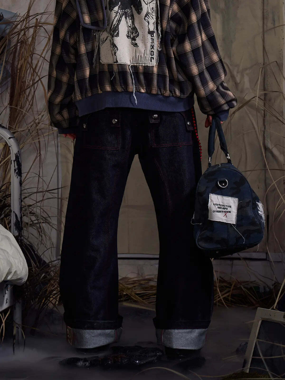 【EMOBROTHER】EMO "No Money No Peace" Raw Denim Curved Cut Jeans