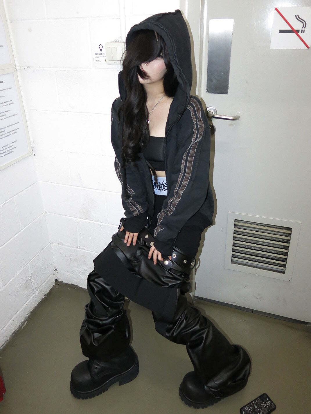 【GOJOYJINNI】 Distressed Draw String Zip Up Hoodie